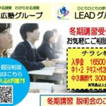 2022年11月28日 / 最終更新日時 : 2022年12月28日 lead-souka.com お知らせ 2022年『冬期講習』のお知らせ 中1 ≪2科≫授業料16,500円+教材費2,200円=18,700円(税込) 中2 ≪2科≫授業料19,800円+教材費2,200円=22,000円(税込)